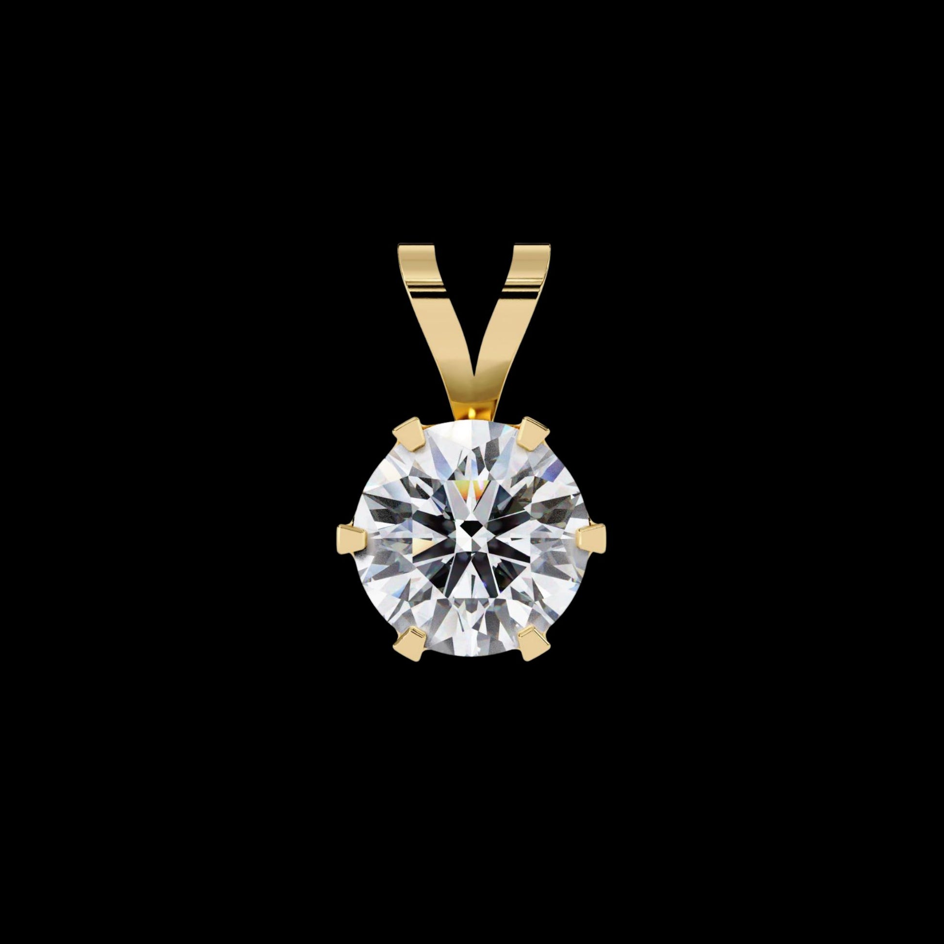 This exquisite pendant radiates timeless sophistication, showcasing a Dazzling Round Cut gemstone elegantly set in a six-prong gold mount. The highly polished gold accentuates the stone’s luminous sparkle, producing a mesmerizing dance of light with every motion. Its sleek V-shaped bail introduces a modern flair, harmoniously blending traditional elegance with contemporary design. Ivevar Luxury Crafts for those who value refined simplicity, this pendant embodies grace, purity, and everlasting allure.