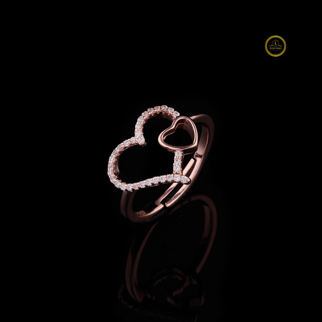 This elegant rose gold ring features a stunning double heart design, symbolizing love and connection. The larger heart is beautifully encrusted with sparkling round diamonds, while the smaller polished heart nestles gracefully within it, creating a timeless and romantic aesthetic. Perfect for anniversaries, engagements, or as a gift of affection, this piece combines sophistication, shine, and sentimental value in one captivating design.