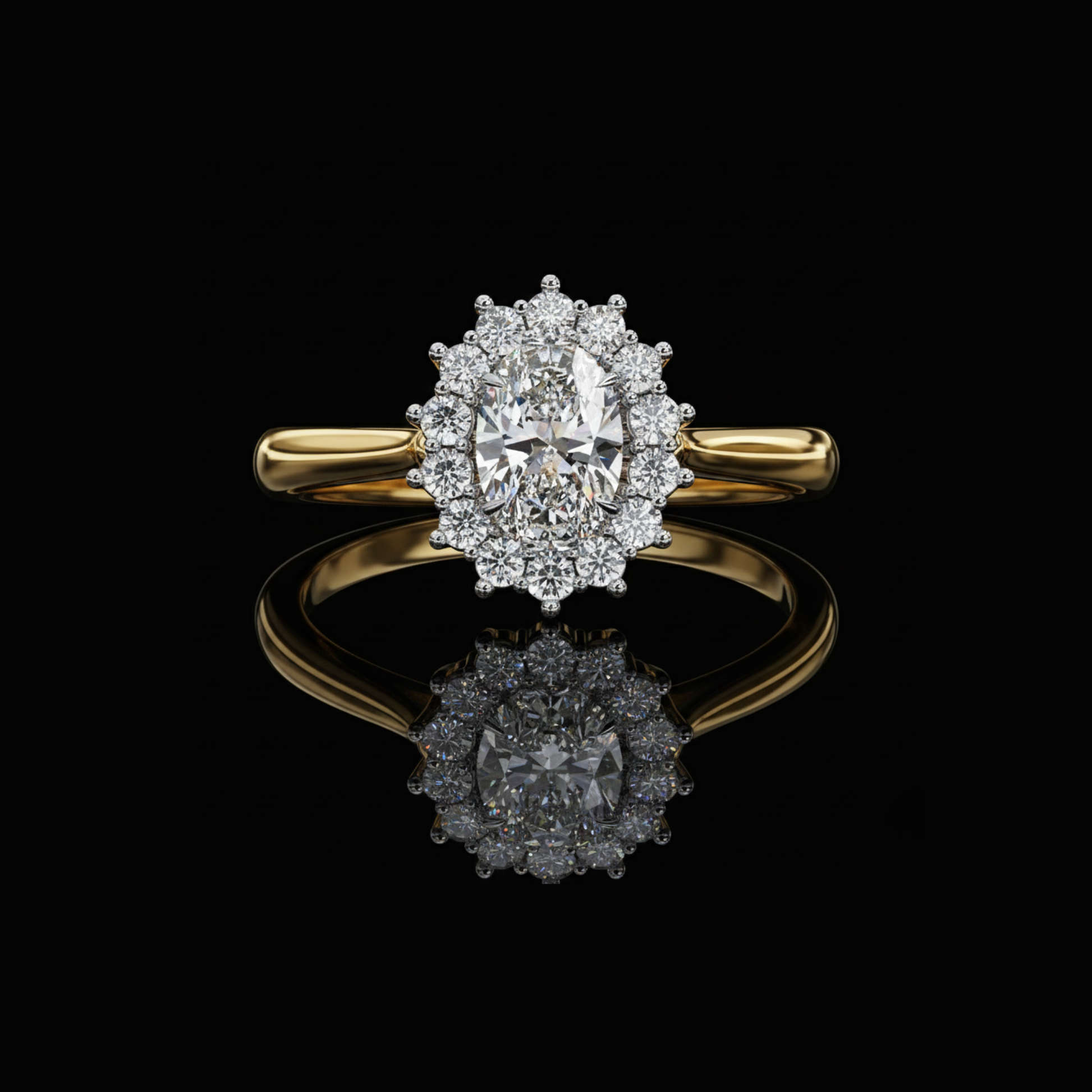 Elevate your moment with this breathtaking oval-cut halo diamond ring, crafted in rich designed to capture light from every direction. The center oval diamond radiates unmatched fire, while a surrounding halo of brilliant round diamonds adds exceptional sparkle and dimension. This piece from Ivevar Luxury embodies timeless elegance, making it perfect for engagements, anniversaries, or unforgettable gifting. The sleek gold band, precision-set halo, and high-clarity diamonds come together to create a ring that feels both modern and eternally classic — a true symbol of love and sophistication.