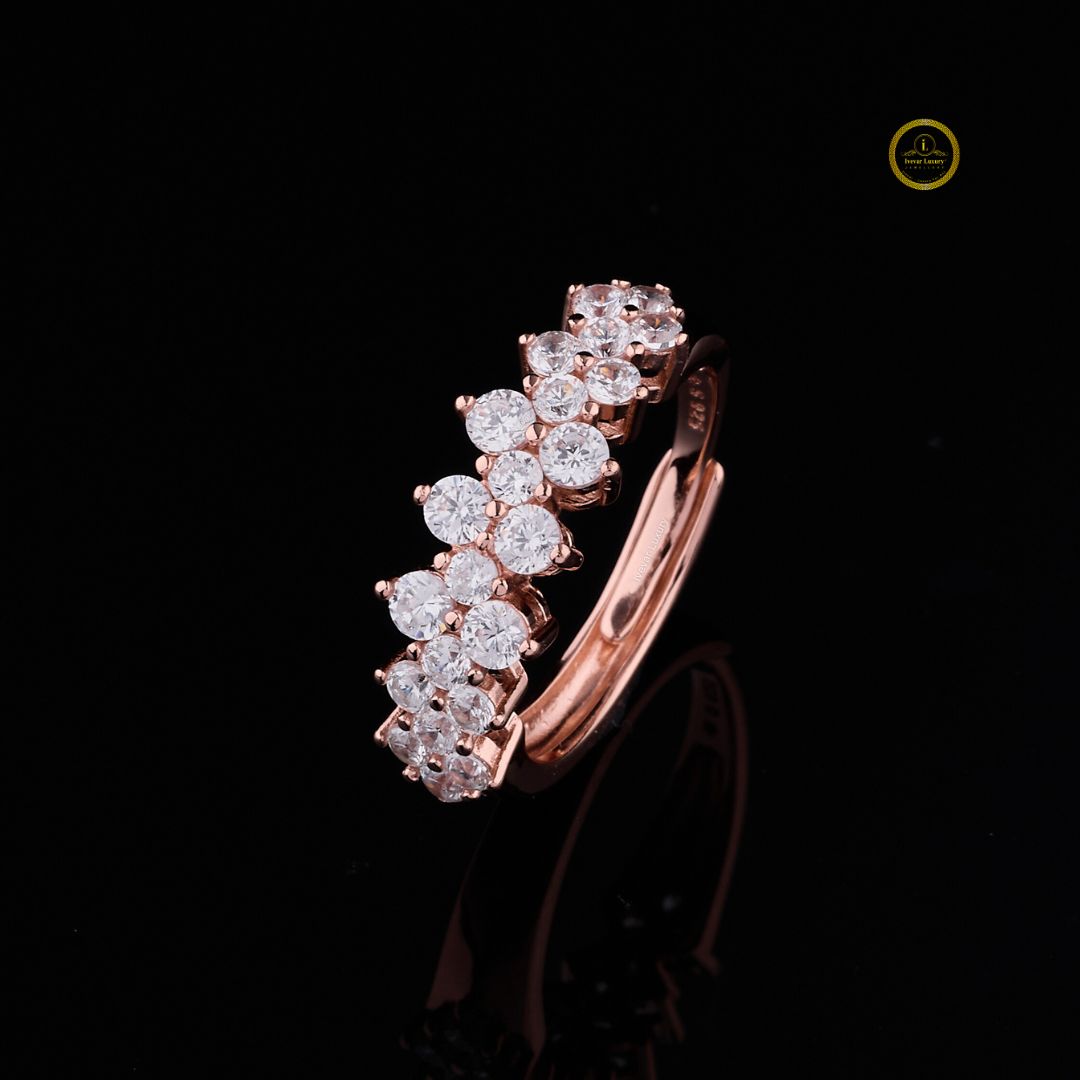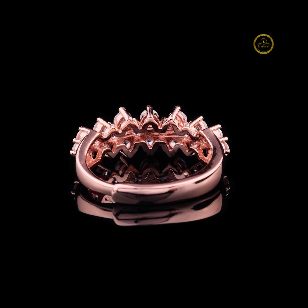 Elevate your elegance with this stunning rose gold diamond cluster band, featuring two rows of round-cut brilliantly faceted round diamonds arranged in a shimmering floral-inspired pattern. The warm rose gold metal enhances the ring’s radiant sparkle, making it a perfect choice for everyday luxury, special occasions, or a timeless stacking look. Crafted with precision, this band delivers a beautiful blend of brilliance, symmetry, and modern sophistication.