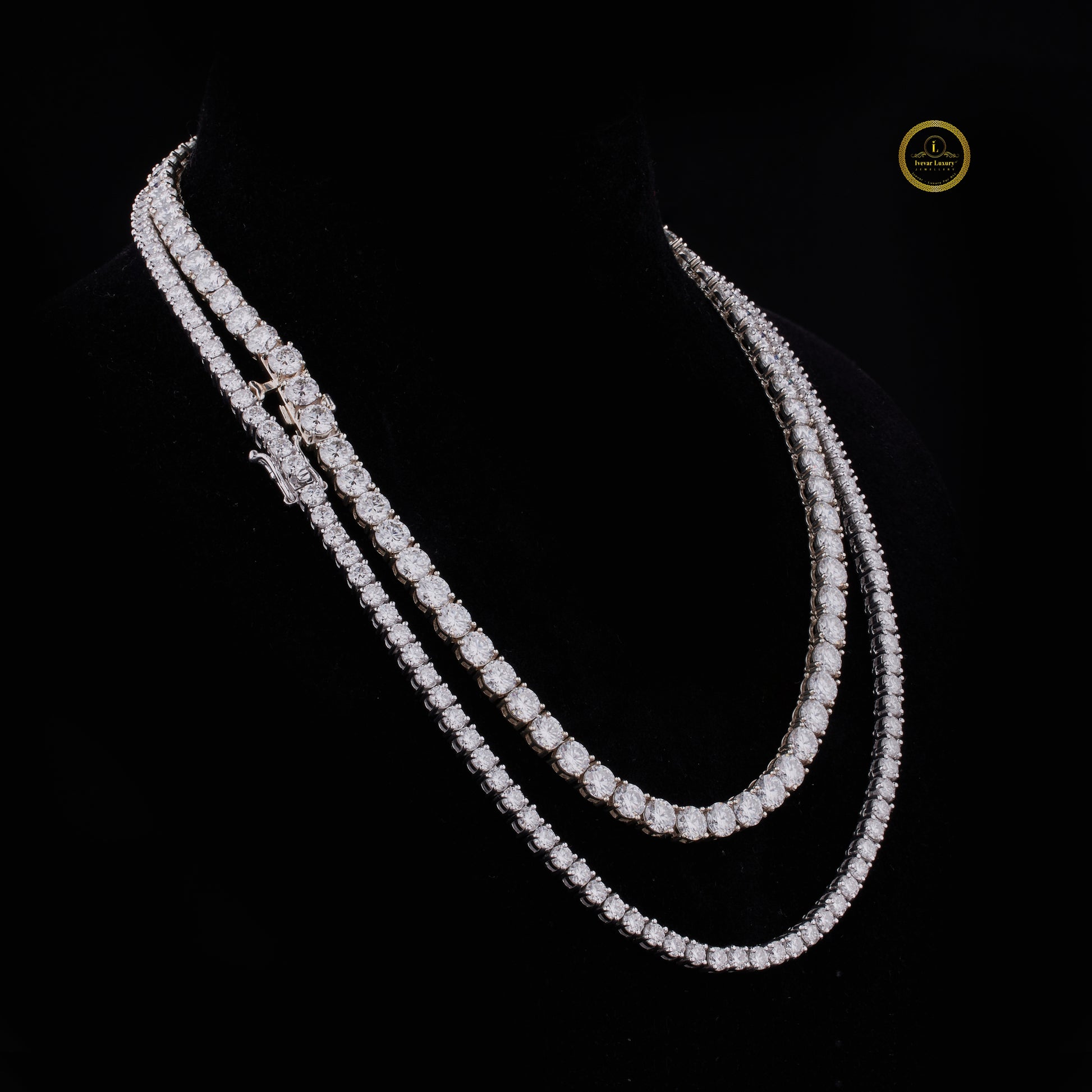 This image displays a magnificent double-layered tennis chain adorned with brilliant moissanite stones, an excellent and durable alternative to natural diamonds. The design features a classic, flexible line of individually set, round-cut stones.