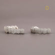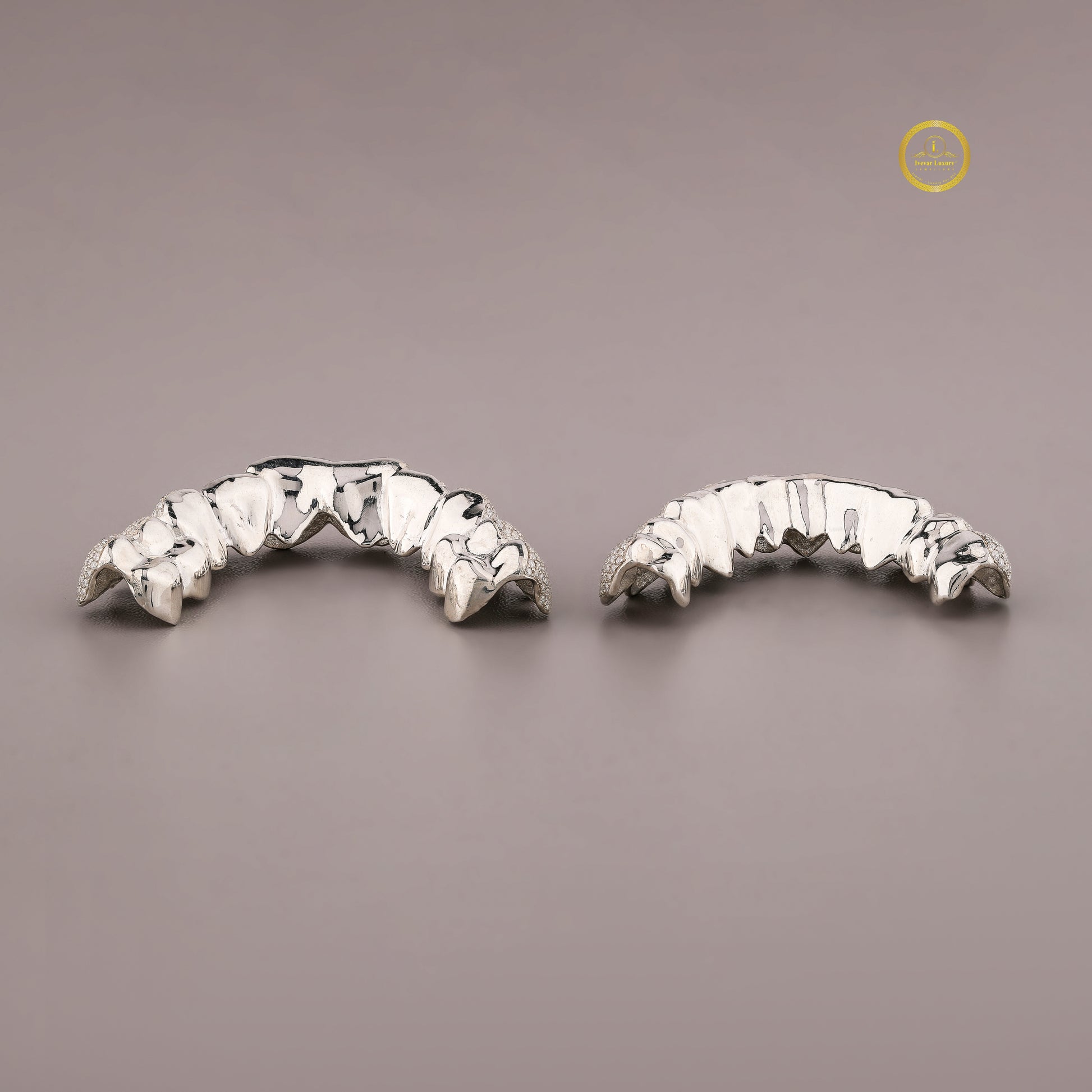 This impressive set of custom grillz is a luxurious display, covering both the upper and lower teeth in a "full set" style. The design utilizes a technique known as pave setting, where numerous small Moissanite stones are set closely together. Moissanite is valued for its superior brilliance and fire compared to natural diamonds, offering a stunning, reflective, "iced out" look.