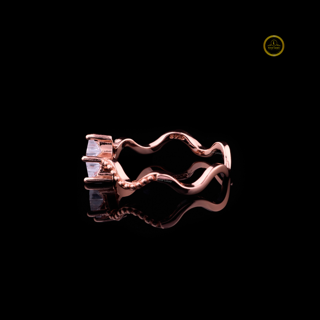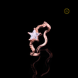 This exquisite ring features a shimmering star-shaped set in lustrous antique cut rose gold, creating a look that is both delicate and enchanting. The wavy band design adds a touch of modern elegance, while the polished finish enhances its luxurious appeal. Perfect for those who love celestial-inspired jewelry, this piece symbolizes hope, light, and brilliance, making it a captivating addition to any collection.