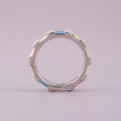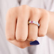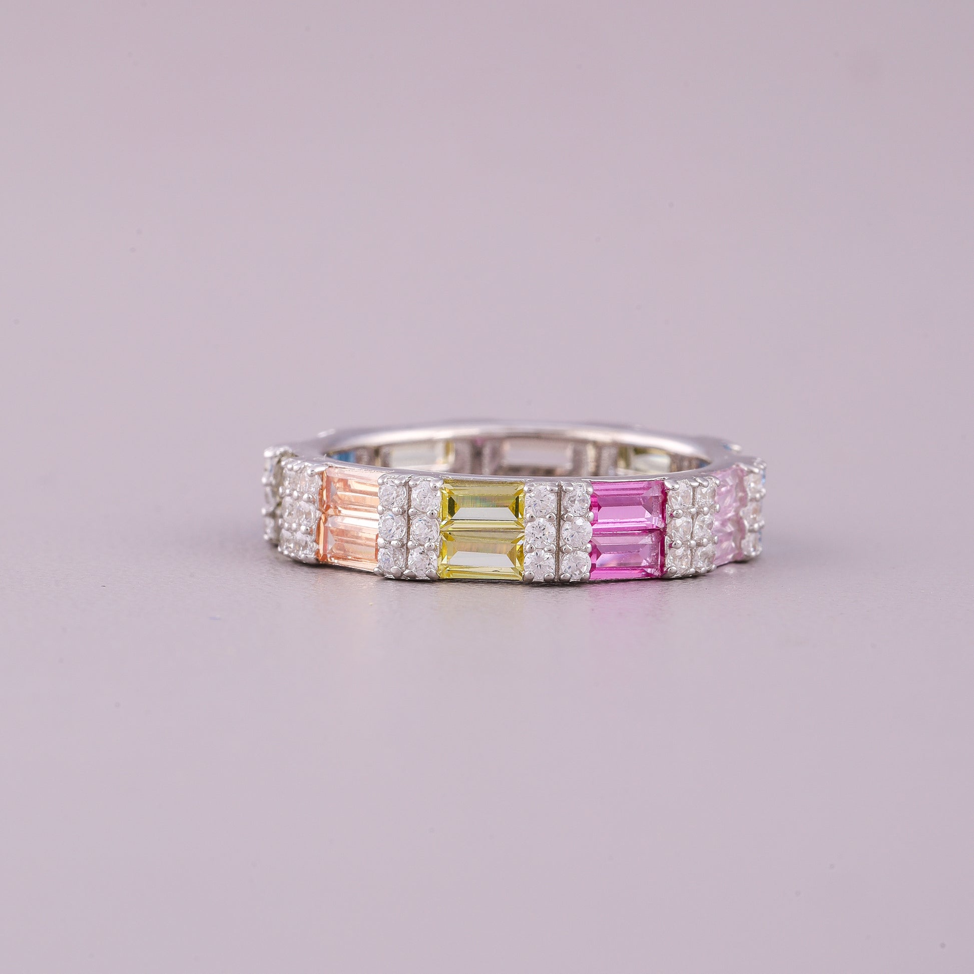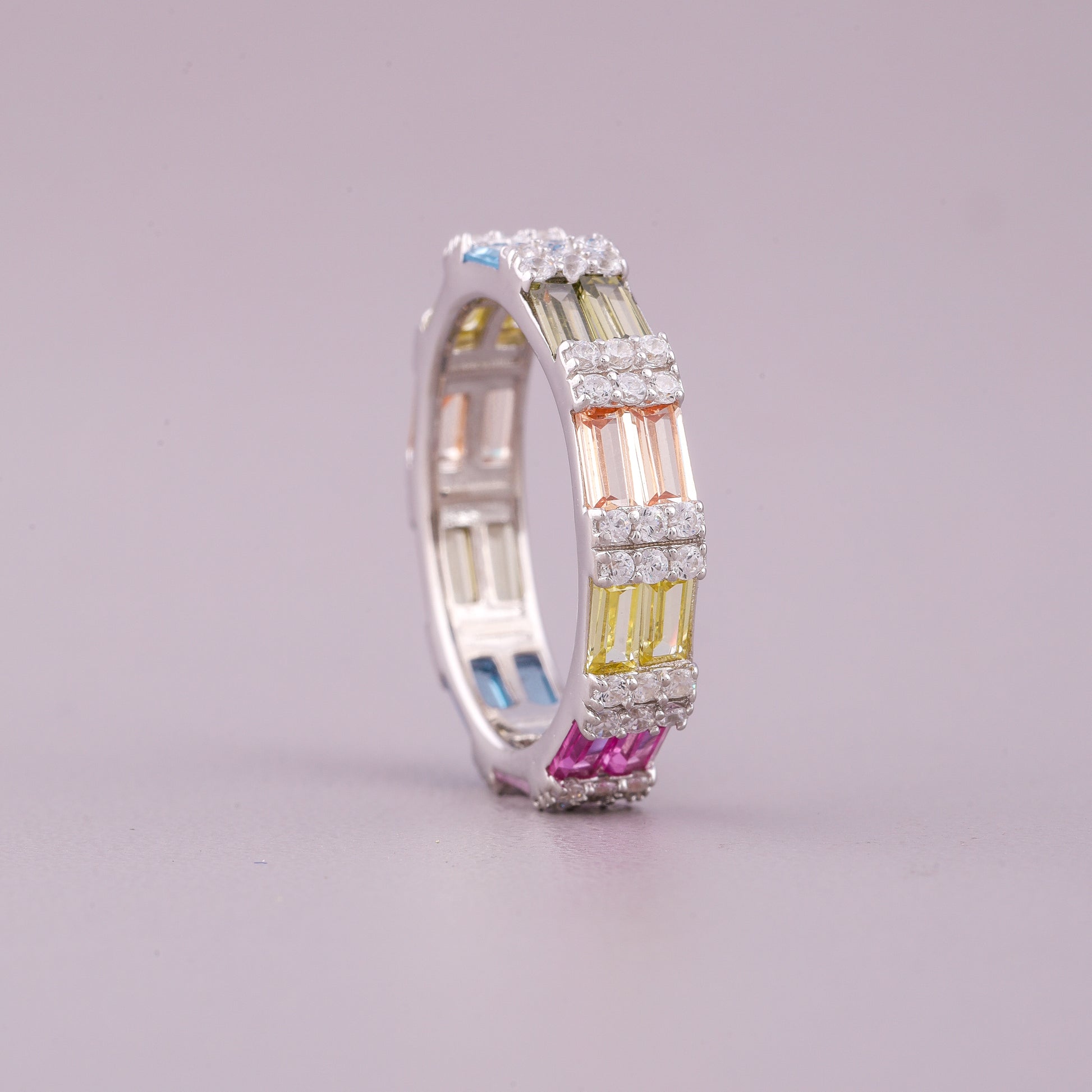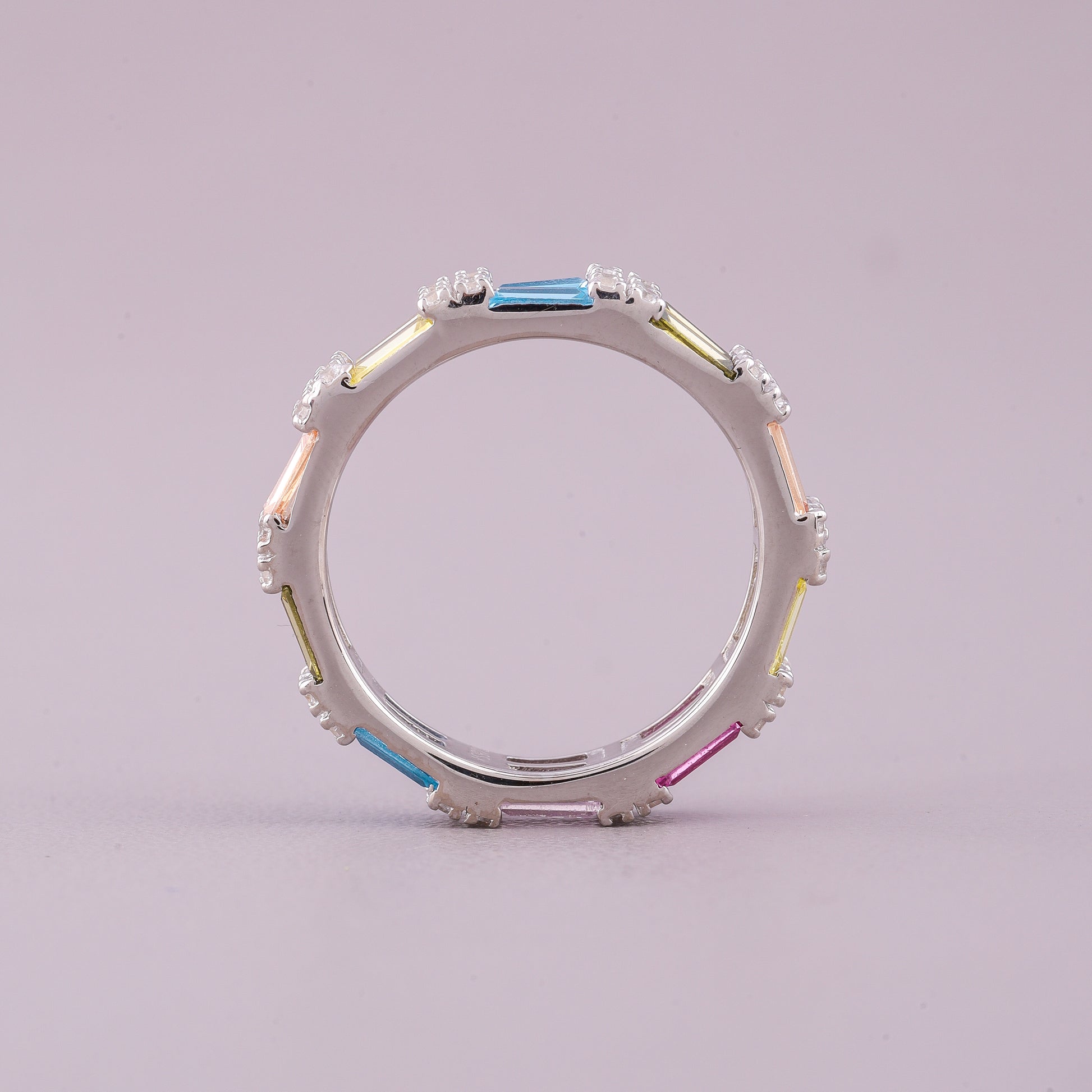 The straight, geometric lines of the baguettes contrast beautifully with the brilliance of natural diamonds, which often accent the colorful sapphires, enhancing their sparkle. Set in a precious metal like white, yellow, or rose gold, this ring offers a unique, durable (sapphires are a 9 on the Mohs scale), and captivating alternative to traditional single-stone jewelry, perfect for a wedding band, anniversary gift, or a standout fashion ring.