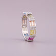 This exquisite natural sapphire and diamond ring is a vibrant statement piece, likely crafted in a modern or Art Deco-inspired style. It prominently features baguette-cut sapphires arranged in a striking "rainbow" or multicolored spectrum, showcasing the gem's broad color range—from blues and pinks to yellows and greens.