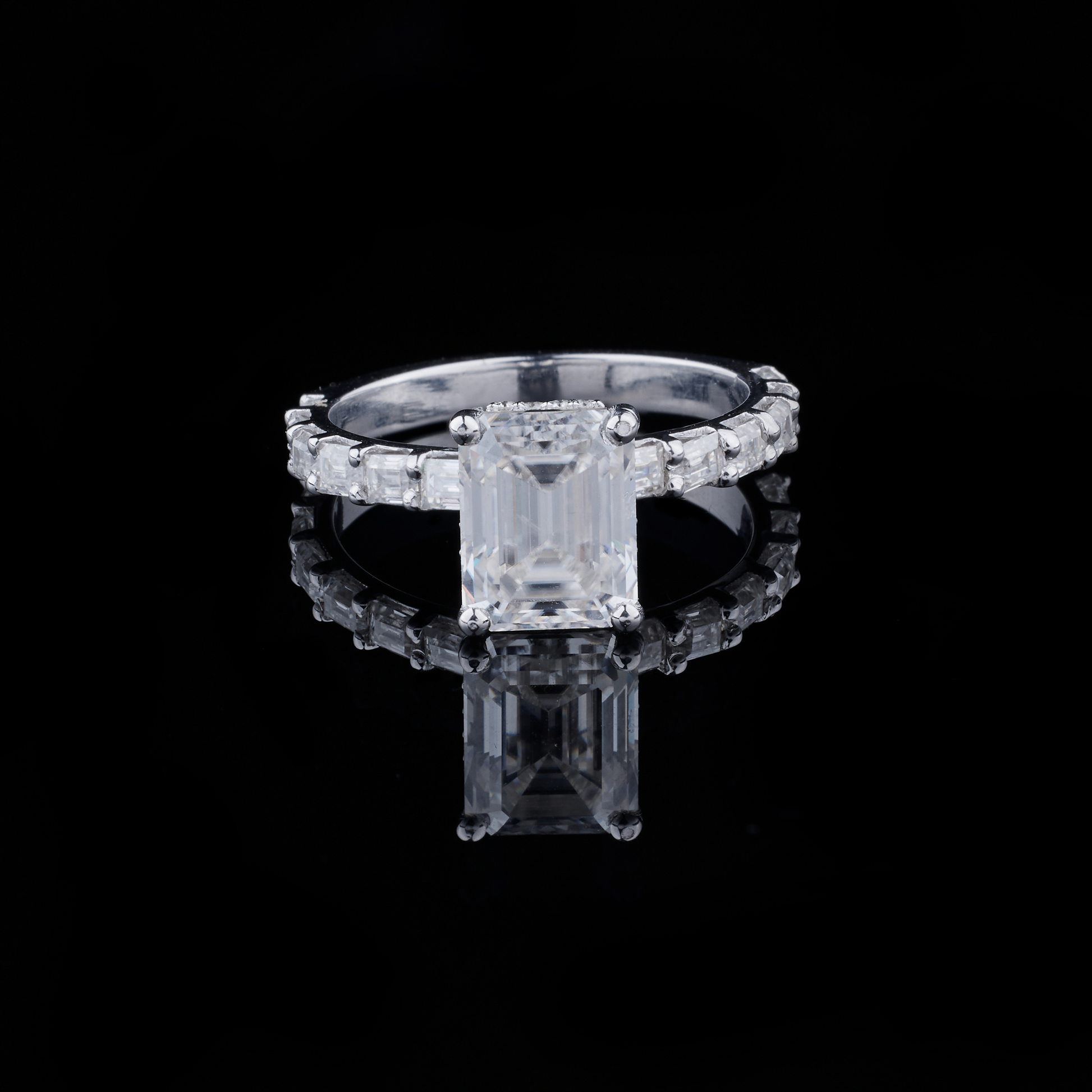 Step into timeless sophistication with this emerald cut diamond ring from Ivevar Luxury. The captivating rectangular center stone is set in a sleek, high-polish ring, adorned with round-side diamonds and also baguette that enhance its brilliance and depth. Designed for those who appreciate modern elegance and luxurious shine, this ring is a statement of refined beauty and eternal love.