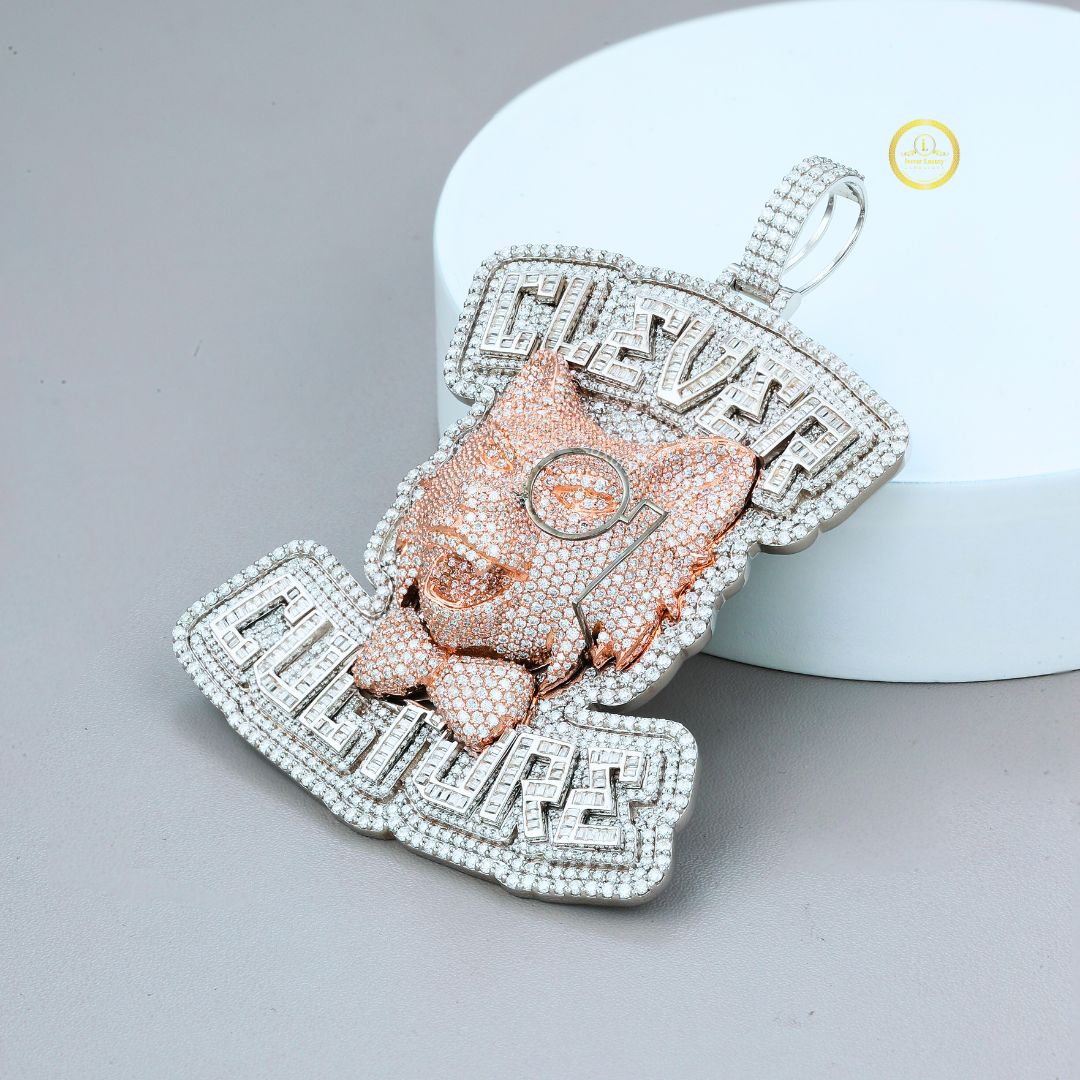 The central figure is framed by an outline and text, possibly reading "CLEVER" above and "DIAMOND" below (though the full text is partially obscured), all densely paved with brilliant white lab-grown diamonds. The overall design is large, opulent, and features a mix of metal colors for a high-contrast, luxurious finish, typical of high-end hip-hop or streetwear jewelry.